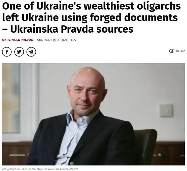 综合乌克兰新声音网站和《乌克兰真理报》7月7日报道,来自乌克兰总检察长办公室和商界的消息人士透露,乌克兰寡头之一、金融集团“普里瓦特”(PrivatBank)的前共同所有人根纳季·博戈柳博夫(Hennadii Boholiubov)已经使用伪造文件逃亡出境。报道提到,博戈柳博夫是另一名乌克兰著名寡头、亿万富豪伊霍尔·科洛莫伊斯基(Ihor Kolomoiskyi)的合伙人。