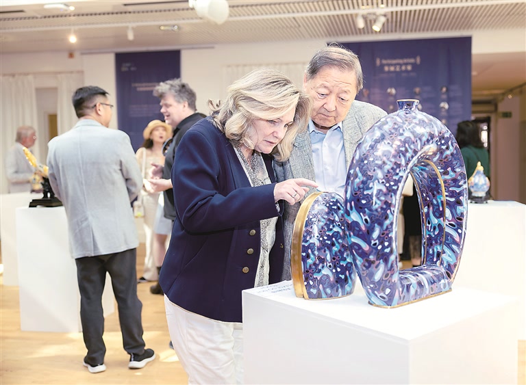 近日,“文明互鉴的见证——中国景泰蓝艺术交流展”在瑞典首都斯德哥尔摩中国文化中心开幕。图为人们正在欣赏中国景泰蓝传统工艺品。 新华社发(魏学超 摄)