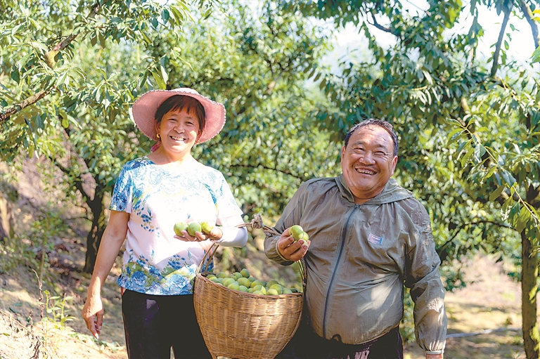 图为7月2日,在重庆市巫山县曲尺乡柑园村,果农张科贵(左)、陈文国夫妇展示刚刚采摘的巫山脆李。新华社记者 黄伟 摄
