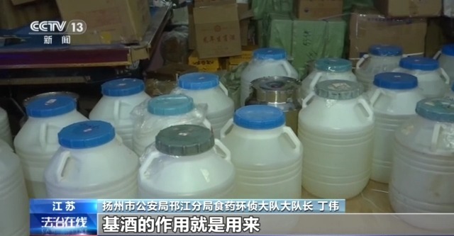 扬州市公安局邗江分局食药环侦大队大队长 丁伟:这是我们在犯罪团伙的生产点查扣的所有的基酒,用塑料桶灌装。基酒的作用就是用来灌装他们销售的白酒(假酒),他们自己操作,自己进行灌装,灌装好了之后把相关的白酒装到假冒包装的盒子里面进行销售。