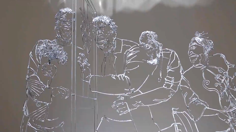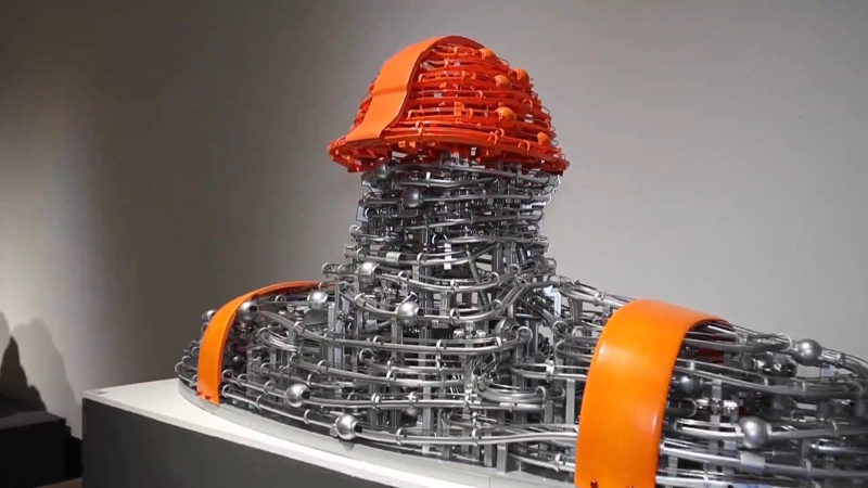 中国蓝新闻记者郑晓彤:来看我身边这件作品《大国脉动》,运用层层轨道塑造出工人形象,拨动这个小球就能够让它在轨道上穿梭,是一件可以互动的雕塑作品。
