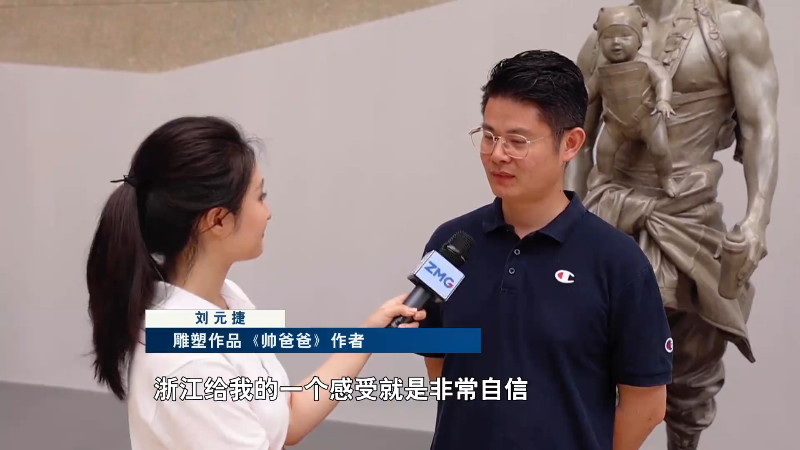雕塑作品《帅爸爸》作者 刘元捷:浙江给我的感受就是非常自信,这样的一个形象潜移默化传递了生活在当下,生活在浙江的一个精神气质。