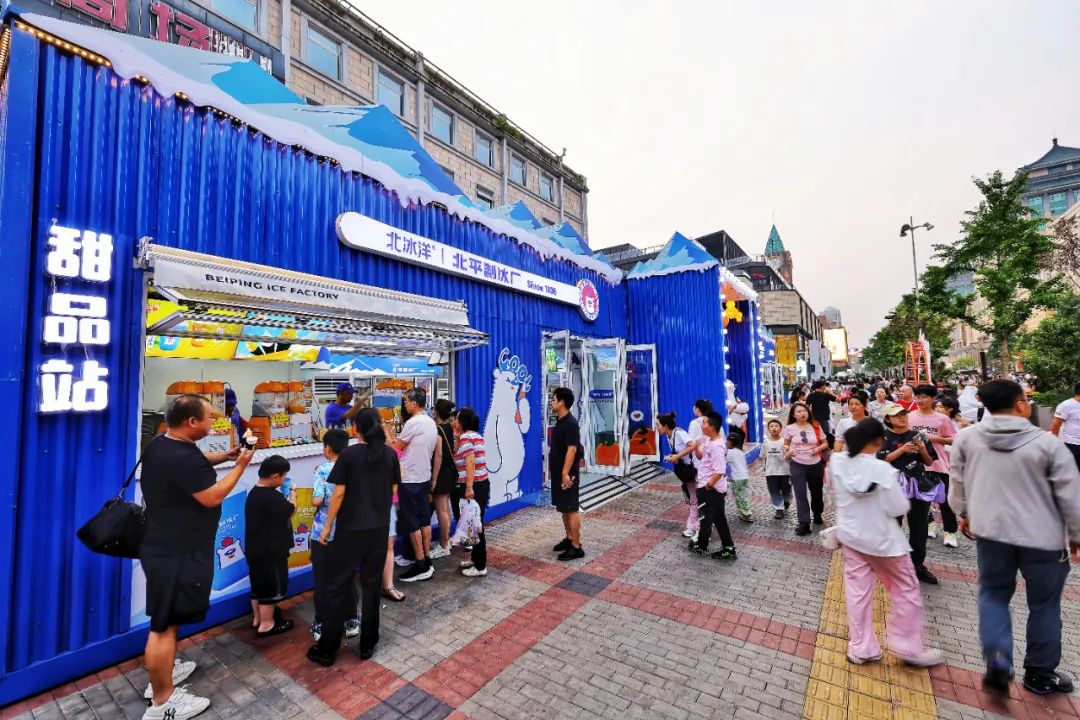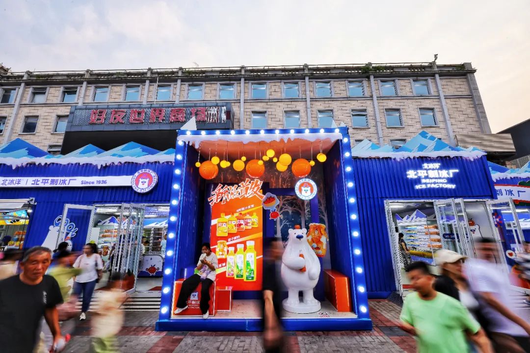 顺着王府井大街往南走,好友世界商场前方空地上,一排蓝白配色的快闪店十分扎眼。走近细看,几名小朋友正排队与门口憨态可掬的白色“冰冰熊”合影留念。店内,老字号“潮牌”北平制冰厂“潮品”集结,桔子冰沙在制冰机器中上下翻滚,在炎炎夏日显得格外清凉。“HPP果汁”“冰冰熊桔子酸奶”“丹茶”等系列产品全新亮相,受到人们的青睐。