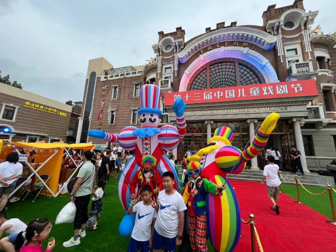 中国儿童艺术剧院的广场前,儿童戏剧节市集迎来高潮,400多平方米的区域设置了16个摊位,围绕《猫神在故宫》等剧目设置了戏剧服装体验、艺术手工、游戏互动、科技好物等环节,用于文创产品、非遗手工、玩偶等产品的售卖,广场上不时传来孩子们的欢笑声。