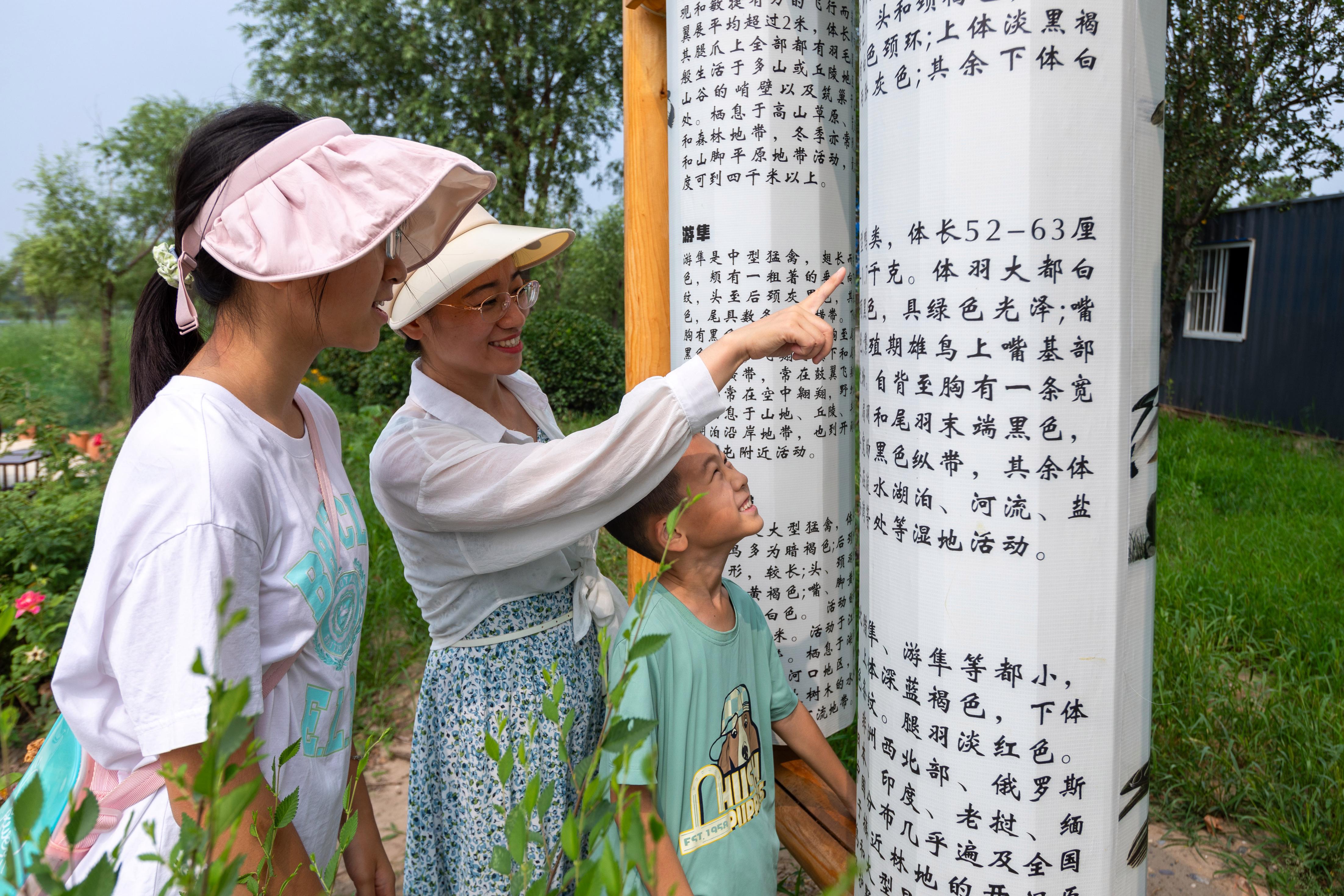 在位于绿堤公园的宛平湖休闲广场上,很多沿着绿道而来的居民正驻足游览。“大型鸭类,长52~63厘米,重0.6~1.7千克……”在广场的鸟类科普展板前,一位市民正在给自己的孩子读翘嘴麻鸭的介绍,小朋友在旁边听得津津有味。“出来玩还能学到关于鸟类的知识,很开心。”小朋友笑着说。