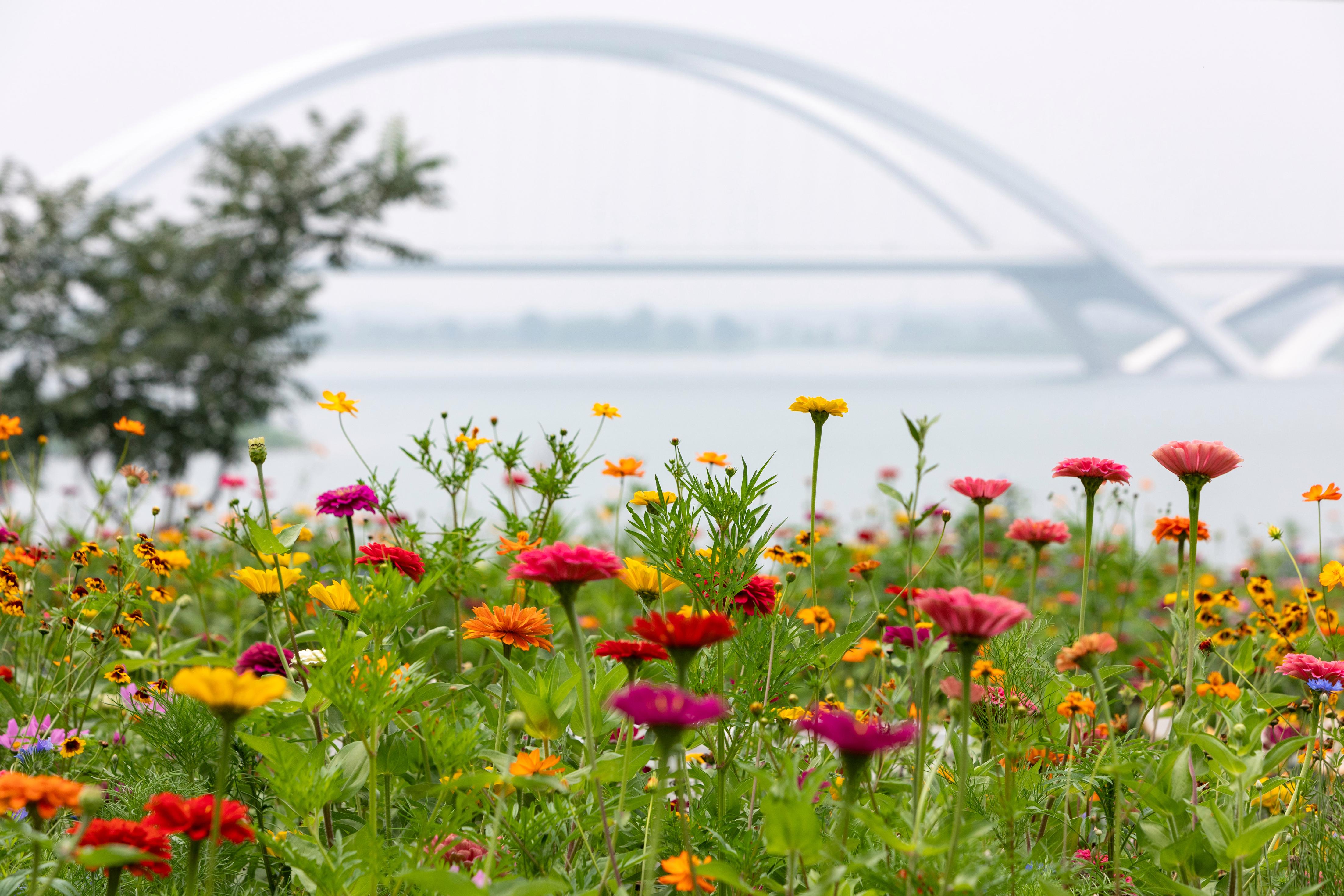 贺茗口中的“那座桥”便是京雄大桥,在位于紫谷伊甸园南侧的绿道上向西南方眺望,烟波浩渺、水天相接间,北京市目前单跨跨度最大的桥梁——京雄大桥就雄踞其上,如中国结一般连通永定河两岸。而“那几片花海”则是花乡花木集团专为绿道打造的生态景观,补种了多年生宿根花卉组团、林下花海等,形成丰富多彩的自然景观。徒步或骑行在鸟语蝉鸣的绿道上,与姹紫嫣红的花海不期而遇,亦是一件浪漫而又惬意的事。