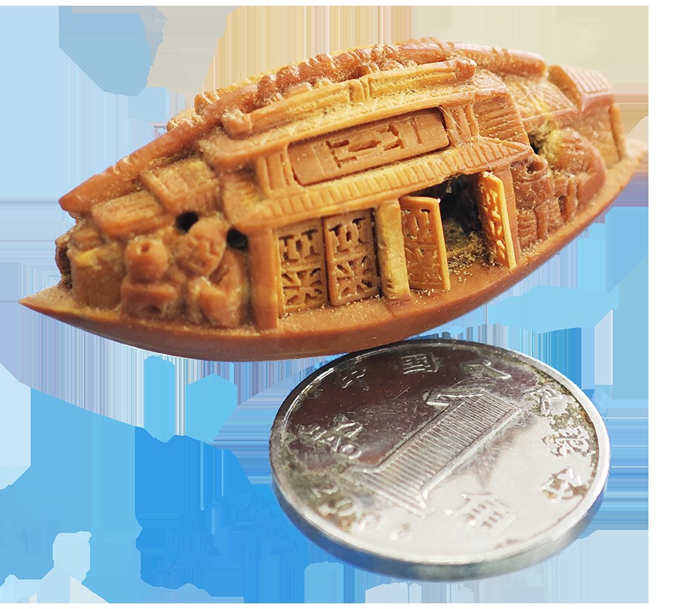传习所内最引人瞩目的展品就是一艘核舟,长宽高不过两枚一角硬币大小的核舟以运河漕船为原型,舟两侧窗户均可打开,船舱里的人物栩栩如生,与《核舟记》的核舟如出一辙。“桃雕的工艺特点可分为粗、中、精三种,核舟的雕刻属精雕,要在一天当中精力最好的时候进行制作,最长不能超过三小时。”云守阳介绍道。