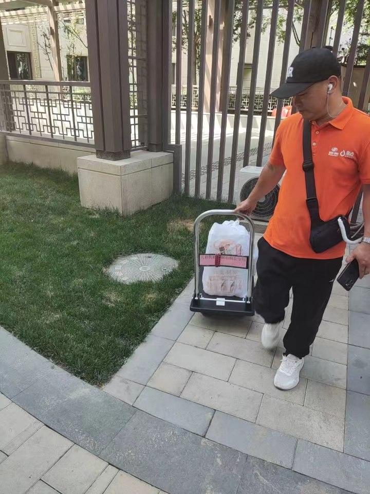 社区工作人员在调研中还发现,外卖、快递员在小区里步行送货不仅效率低,而且消耗大。为此,社区筹集资金,在3个小区6个大门增加了6辆专供小哥送货用的大件外卖专用平板车,小哥骑行至小区门口,即可“接力”拉着平板车进入小区,解决了配送“最后一公里”的同时,还避免了电动自行车在小区里穿行的风险。