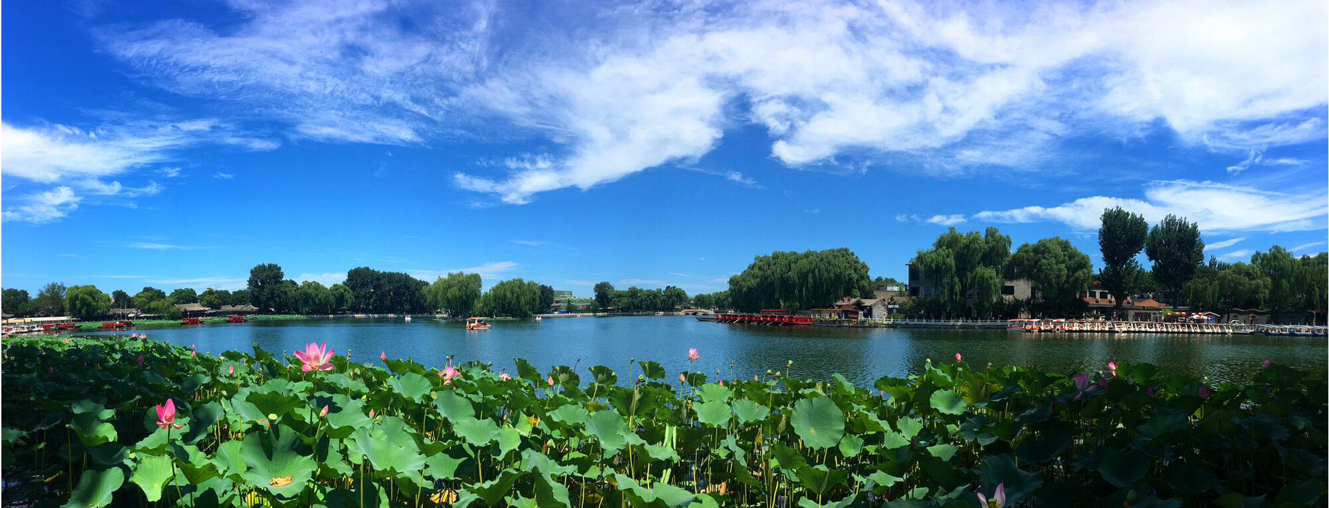 什刹海荷花市场何以成为消夏的“胜地”?或因它所拥有的先天条件。在前海中间,有道串联南北陆地的长堤,将整片水域分成了两个部分。东部约占全水域的三分之二,沿堤岸一带种有荷花,水域中则种植鸡头米。西部约占全水域的三分之一,早年曾种植水稻。长堤里许,两岸杨柳成行,夏日熏风摇曳,荷香扑面,大有江南水乡之景色。