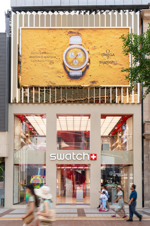 坐落于北京王府井的瑞士斯沃琪店铺于2011年正式亮相,外观延续品牌简约前卫的先锋设计,彰显出品牌极富个性的创新精神与艺术时尚基因。全新升级的店铺坐拥三层空间,设计理念秉持品牌“正向叛逆,趣味盎然”的DNA,赋予独具京韵的全新色彩潮流美学。米色外立面采用贴近自然的仿石材纹理,与金属镜面呈现丰富而立体的光影效果。