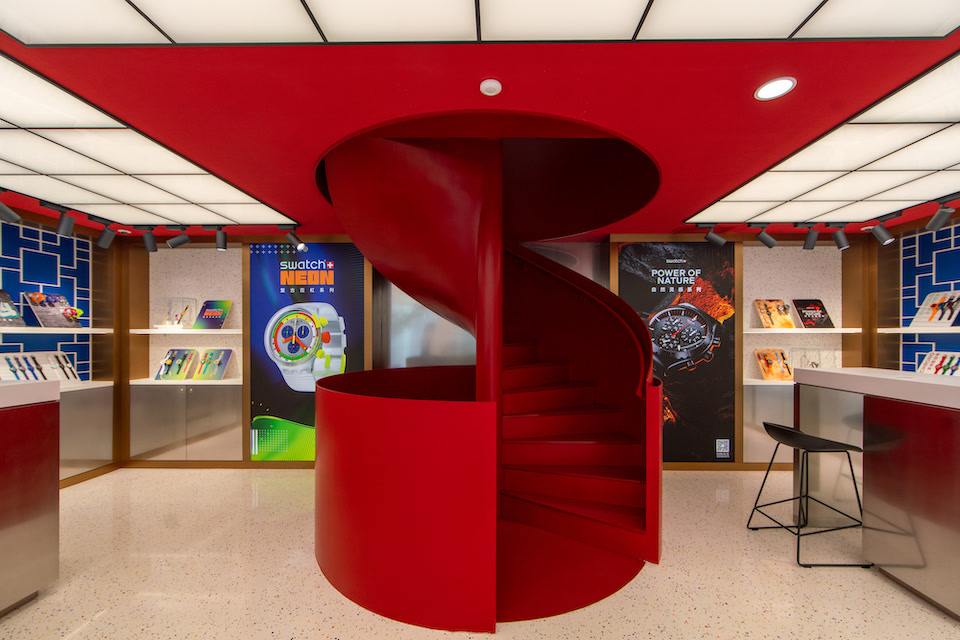 店内通过水磨石的多彩运用,搭配蓝色底纹中式窗格为其添彩泼墨,打破空间界限,与红色的旋转楼梯大胆撞色,鲜明个性,尽收眼底,引领消费者沉浸步入瑞士斯沃琪潮流艺术与先锋技艺共筑的创意世界。