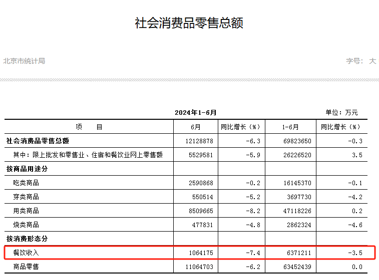 北京市统计局7月17日发布的数据显示,2024年上半年,北京餐饮业实现收入637.1亿元,同比下降3.5%。2024年上半年,餐饮收入占到全市社会消费品零售总额的10.04%,较1-5月份的9.2%占比有所提升,这一数据表明了餐饮市场在总体经济中的重要地位,市场消费继续恢复信号明显。