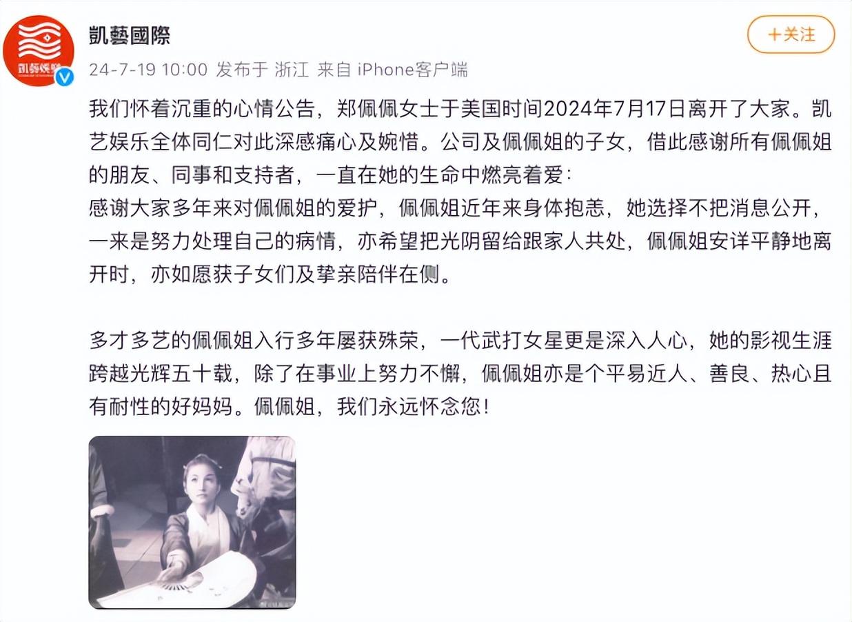 郑佩佩经纪公司也发文称,郑佩佩女士于美国时间2024年7月17日离开了大家。