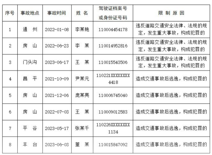 北京市公安交管部门向社会公布8名因发生交通事故构成犯罪,被终生禁驾的人员名单。他们当中年龄最大的69岁,最小的25岁。