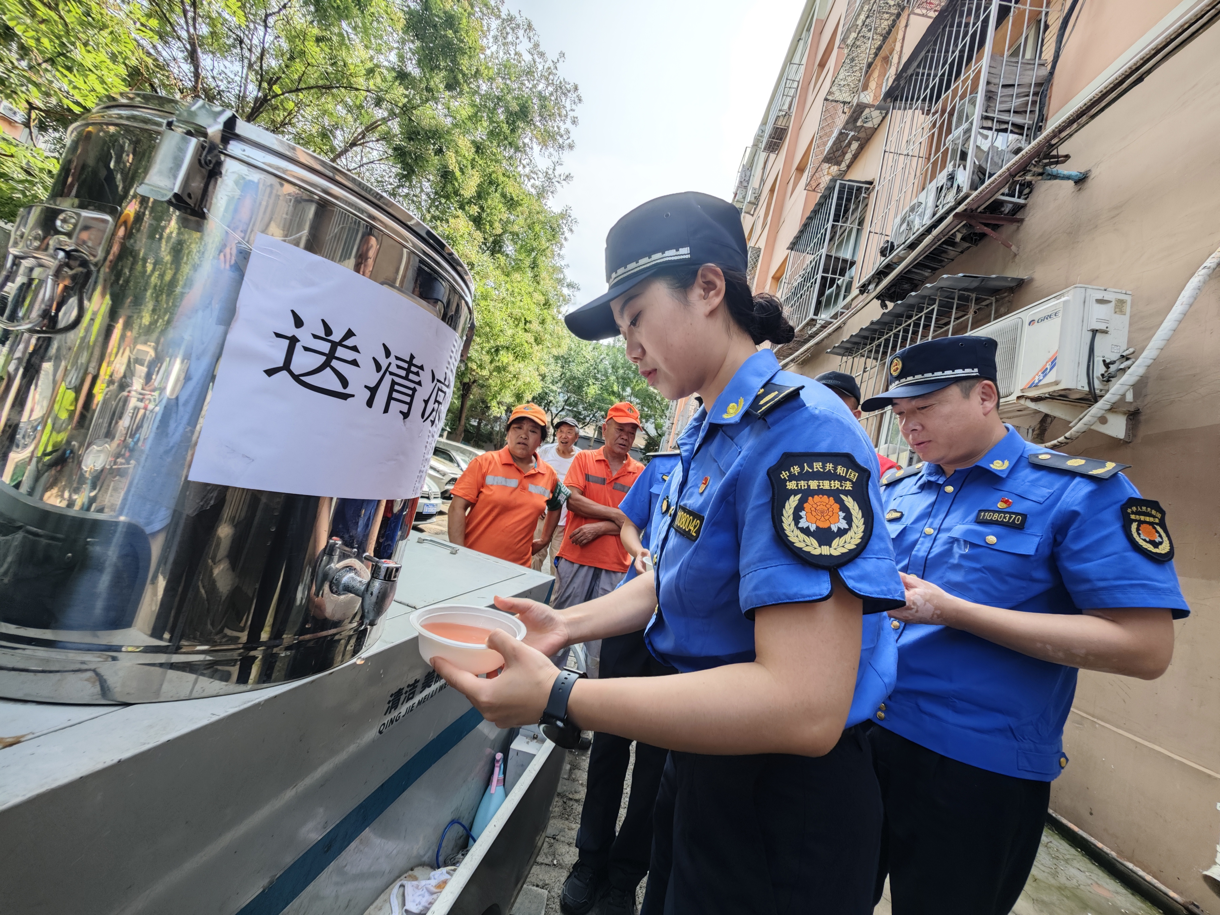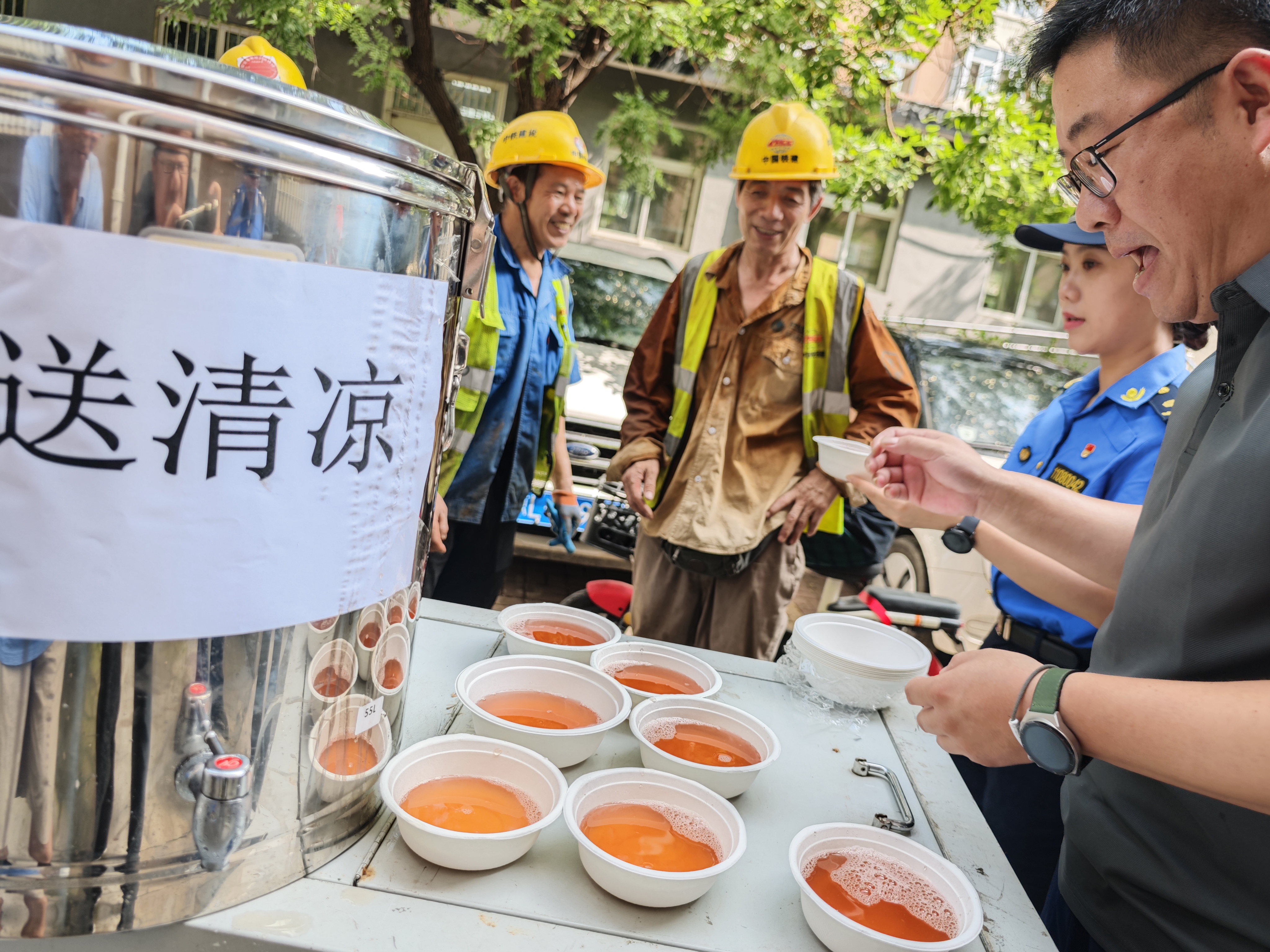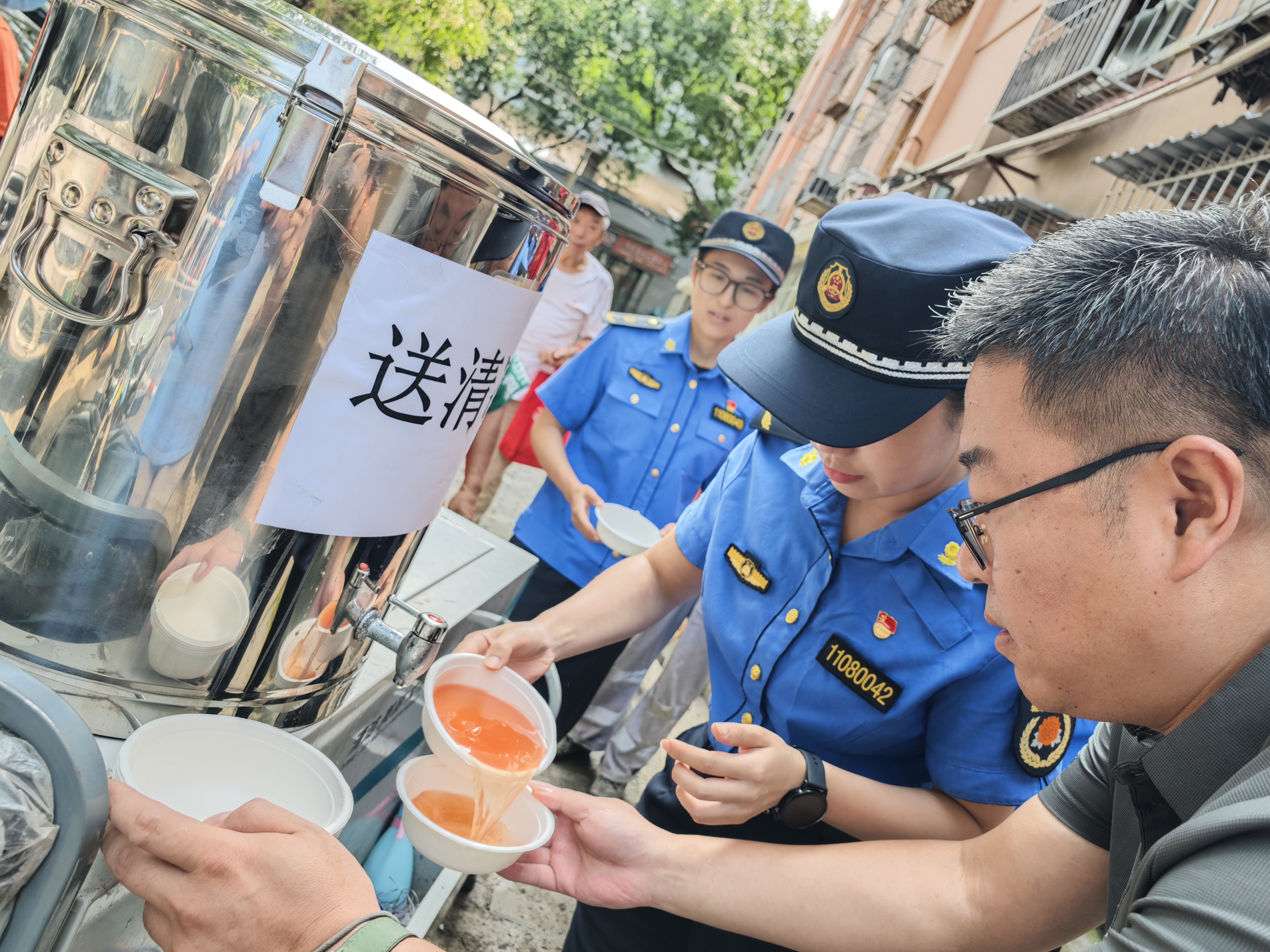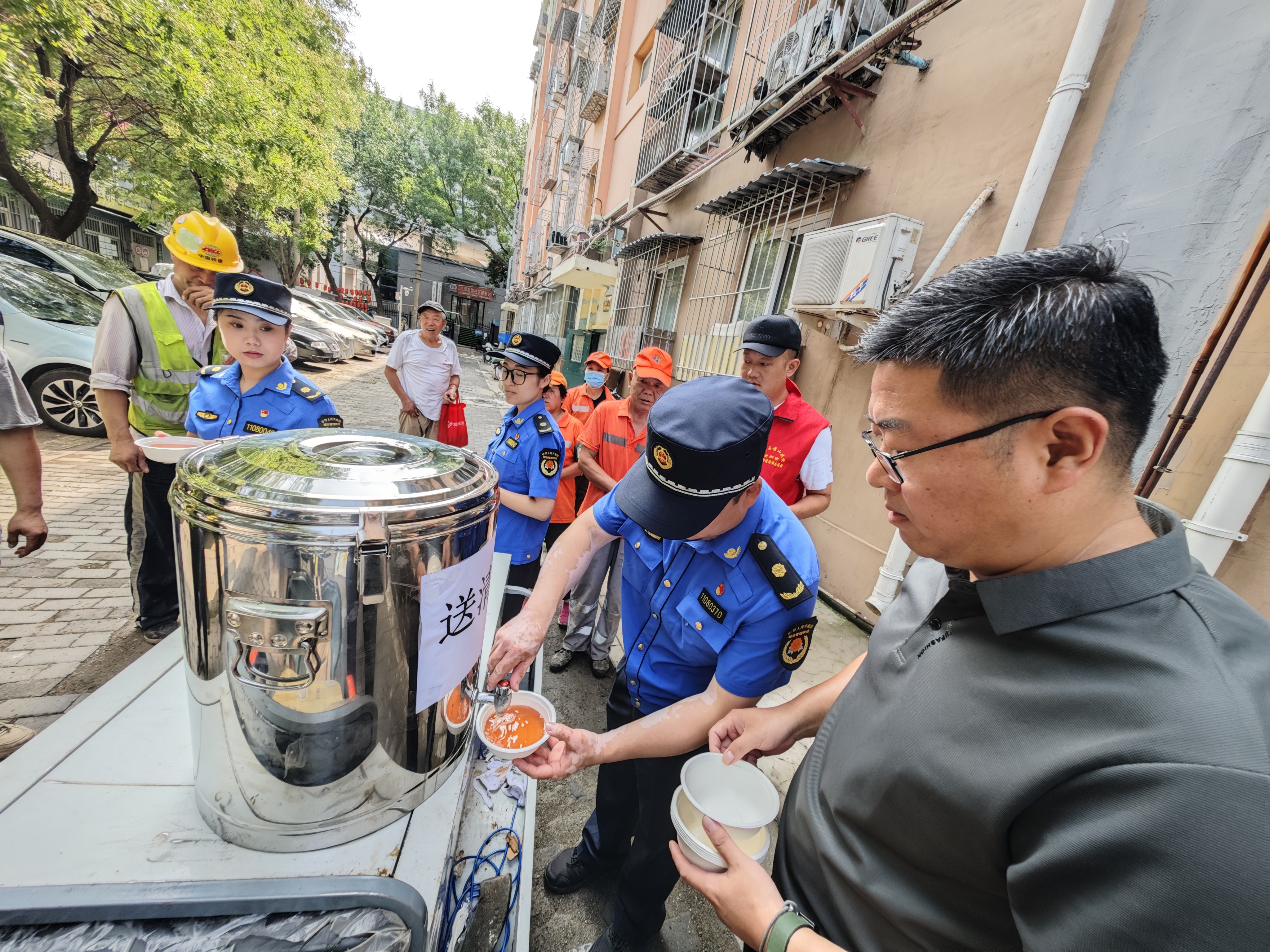 7月22日是大暑节气,石景山区八角街道综合行政执法队联合八角南路社区开展送清凉活动,为奋战在高温下的环卫工人、保安、建筑工人、一线劳动者送去了清凉解暑的绿豆汤,用实际行动送去了一份夏日的关怀与清凉。