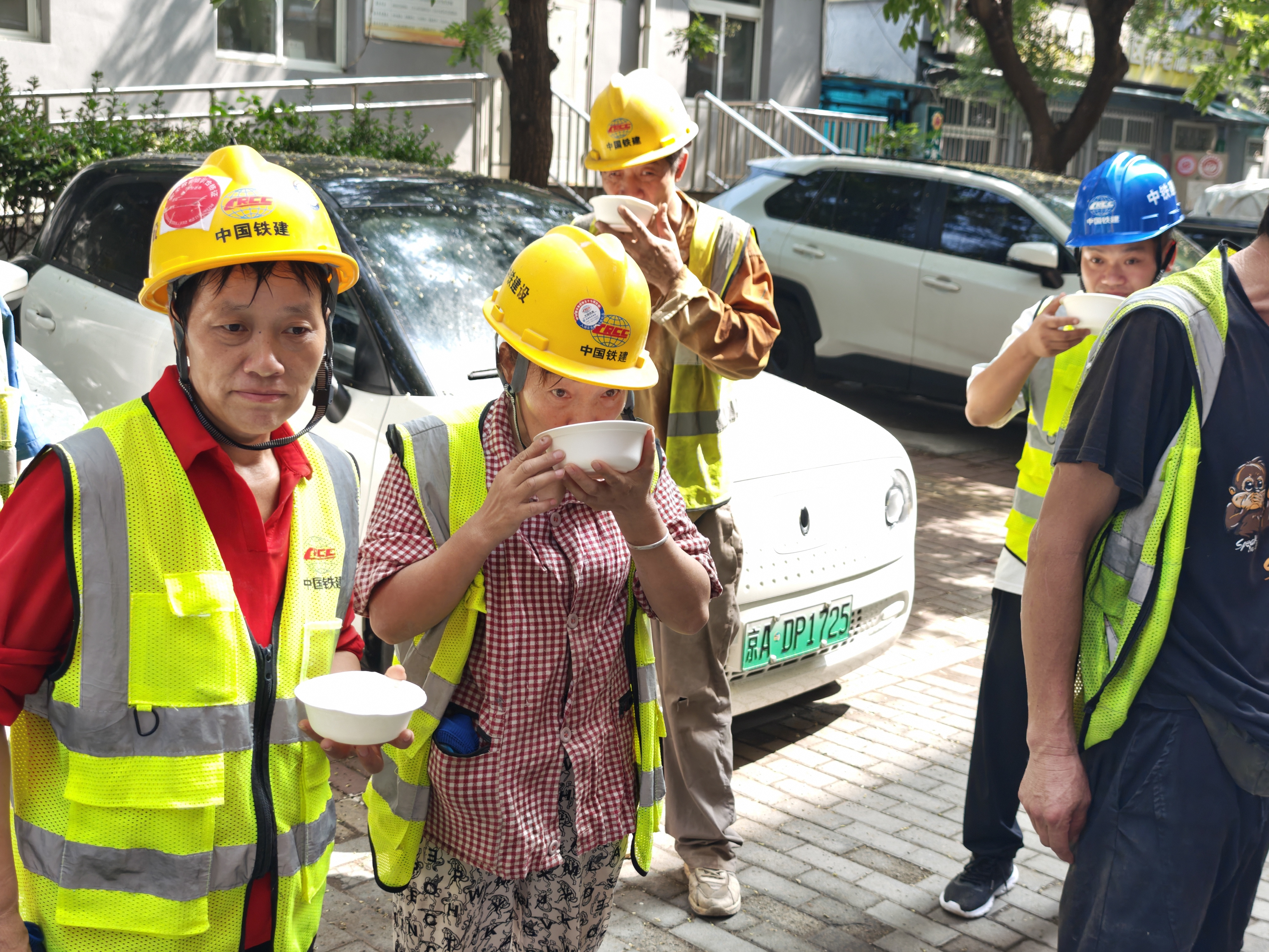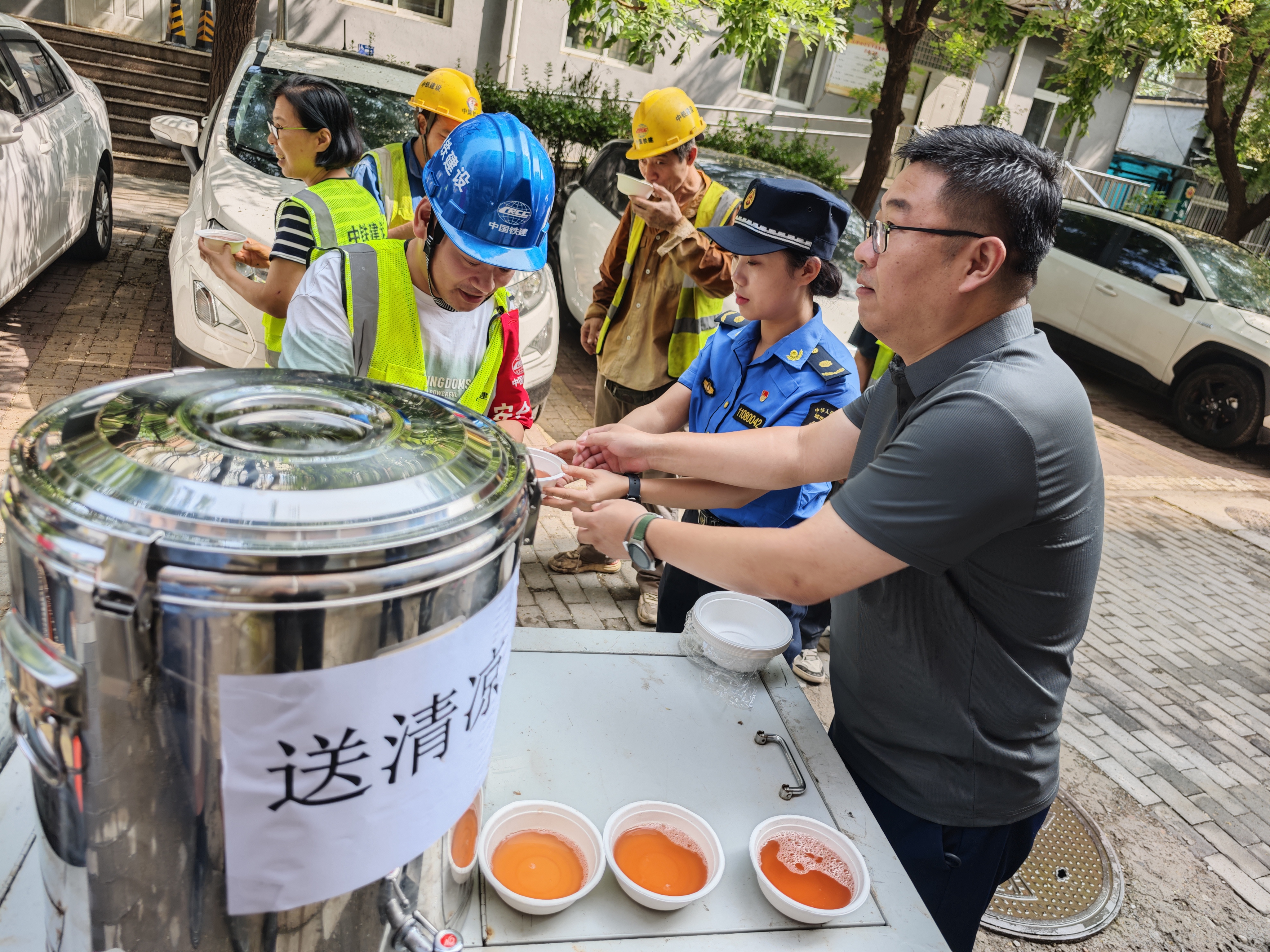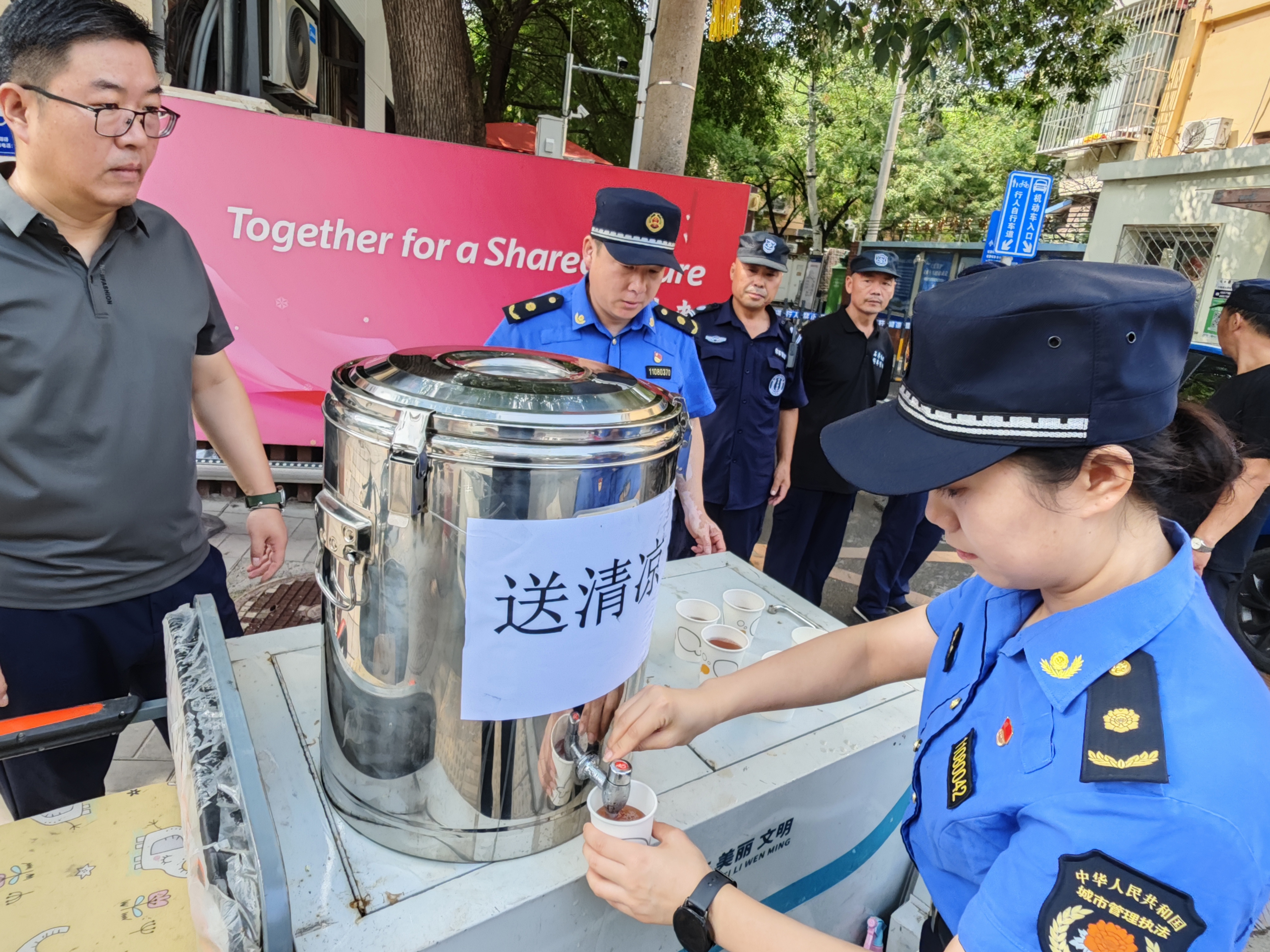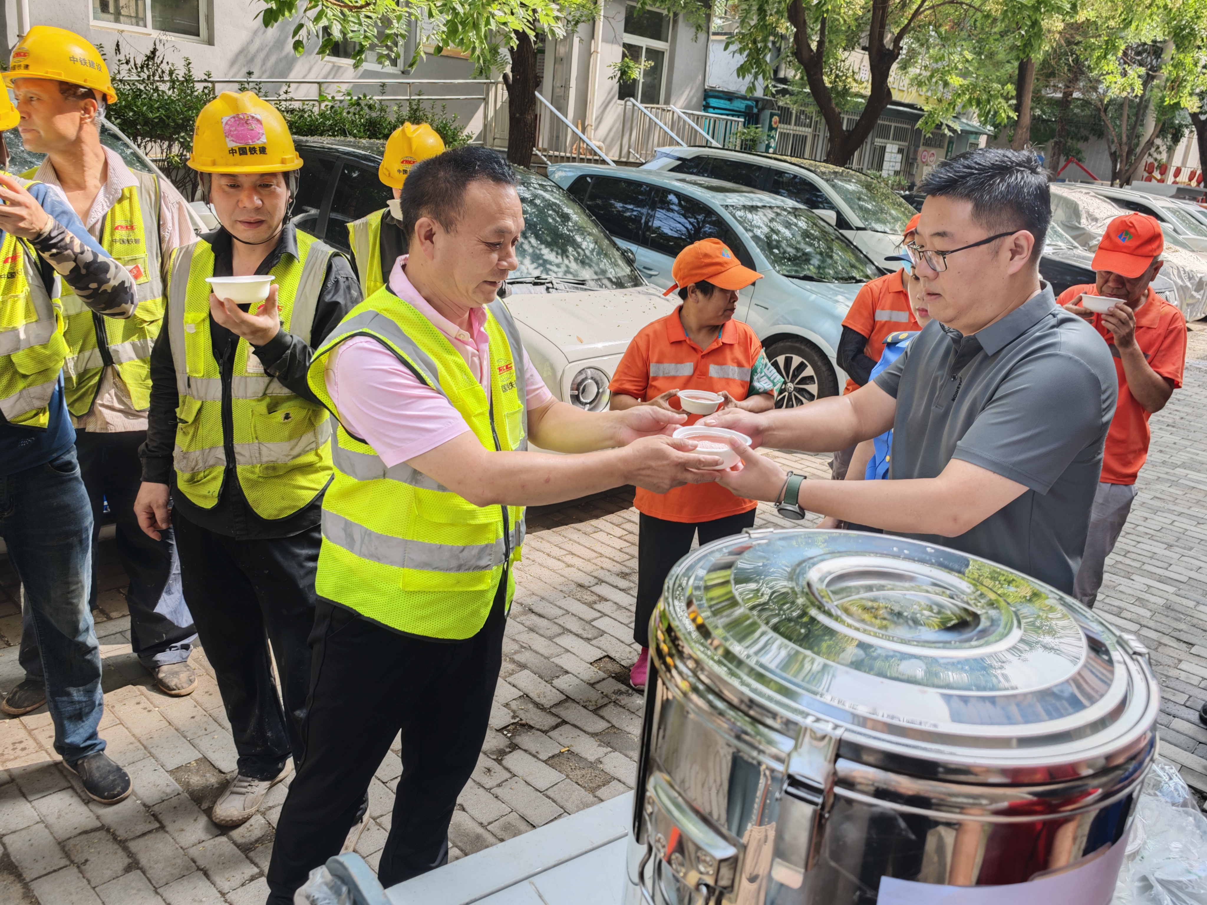 7月22日是大暑节气,石景山区八角街道综合行政执法队联合八角南路社区开展送清凉活动,为奋战在高温下的环卫工人、保安、建筑工人、一线劳动者送去了清凉解暑的绿豆汤,用实际行动送去了一份夏日的关怀与清凉。