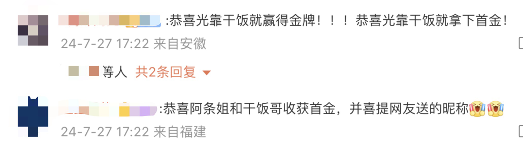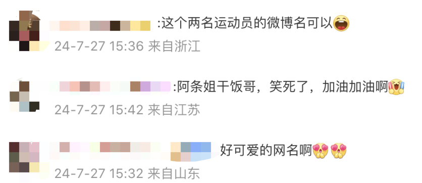 北京日报(ID:Beijing_Daily) 注意到,黄雨婷的微博名为@A阿条本条,盛李豪的微博名为@光靠干饭就 ,两人因此被网友称为“阿条姐”和“干饭哥”。
