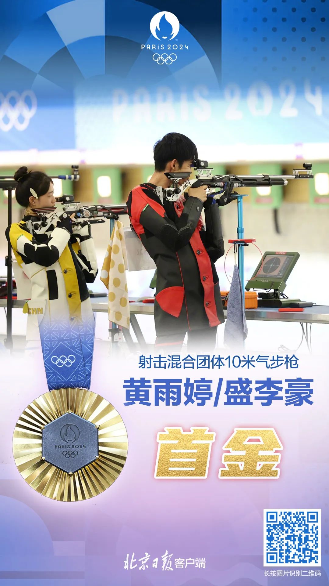 刚刚,在巴黎奥运会射击混合团体10米气步枪金牌赛中,中国组合黄雨婷/盛李豪夺得冠军!这是本届奥运会中国代表团的首枚金牌!