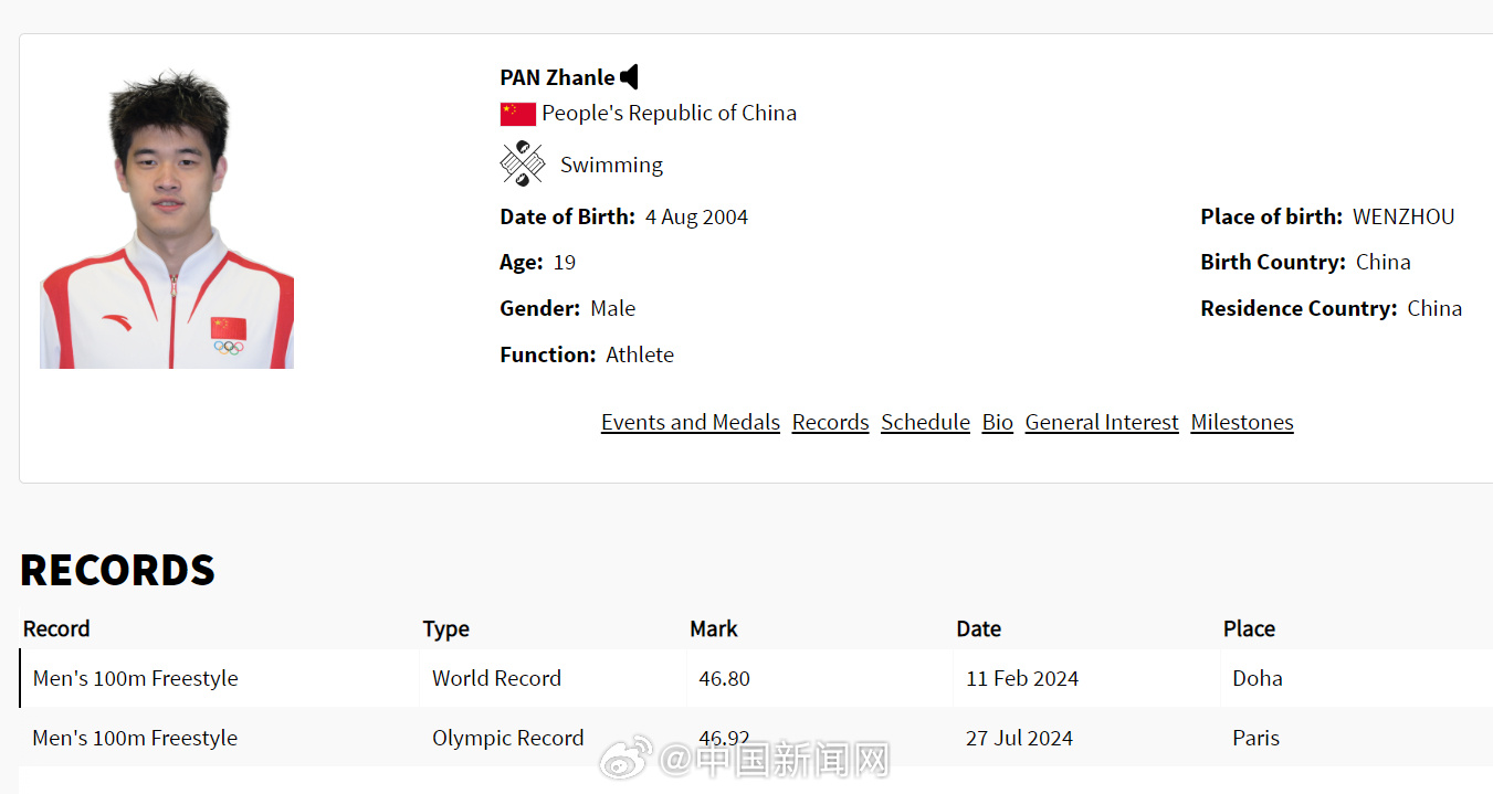 在巴黎奥运会男子4x100米自由泳接力决赛中,潘展乐第一棒游出46秒92,打破男子100米自由泳奥运会纪录(OlympicRecord)。此前,他曾在世锦赛上打破该项目世界纪录(WorldRecord)。巴黎奥运会官方选手资料卡已更新:男子100米自由泳世界纪录与奥运纪录的保持者都是中国选手潘展乐。期待他单项的表现!