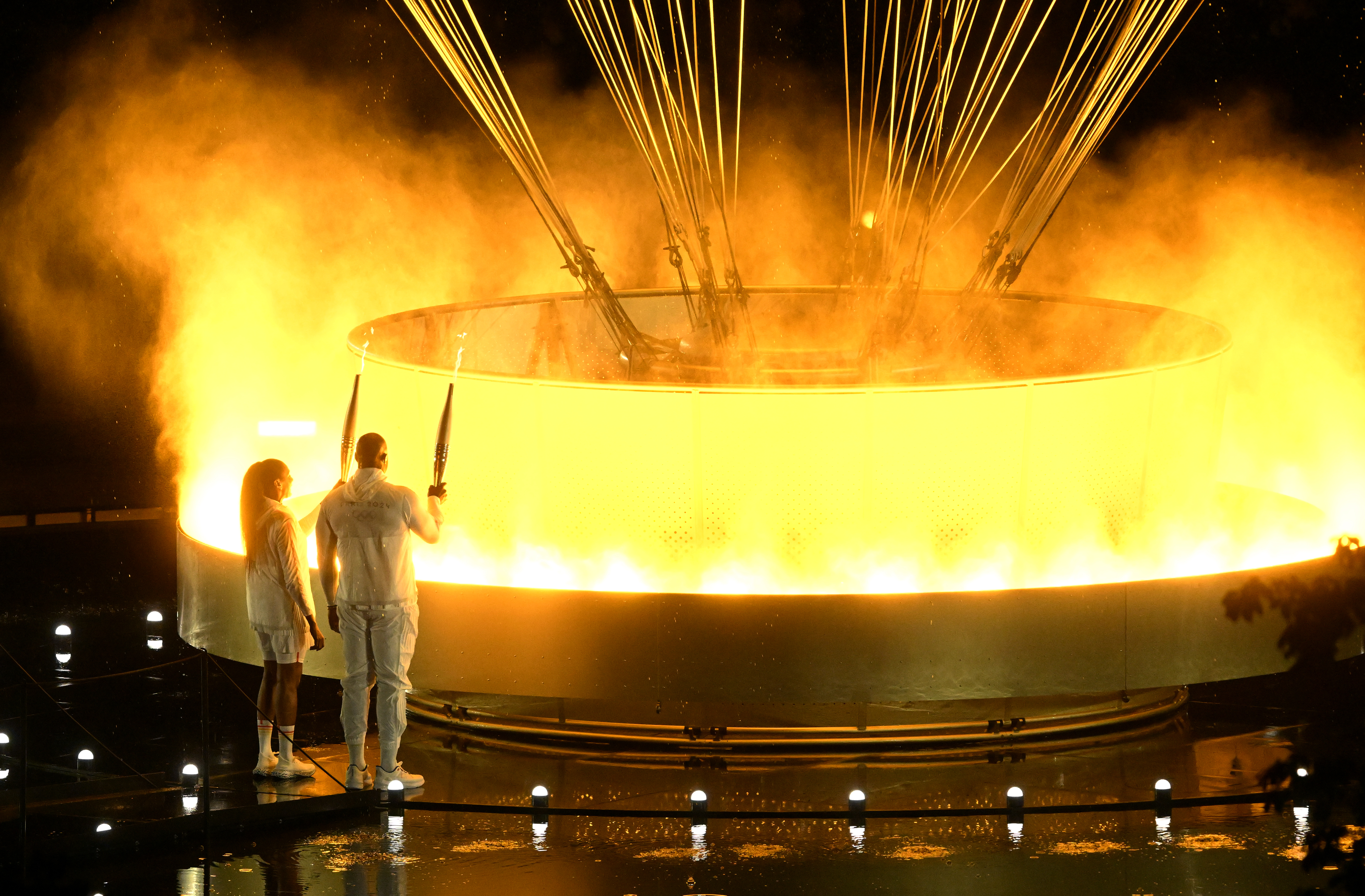 埃斯坦盖介绍,为了实现完美的点火成功的效果,当26日晚最后一棒两名火炬手——法国柔道奥运会冠军特迪·里内和法国田径奥运会冠军玛丽-若泽·佩雷克“点燃”主火炬台时,幕后工作人员通过控制开关同时开启了LED灯与水雾喷嘴,两种不同的“火焰”在一瞬间完成了转换。
