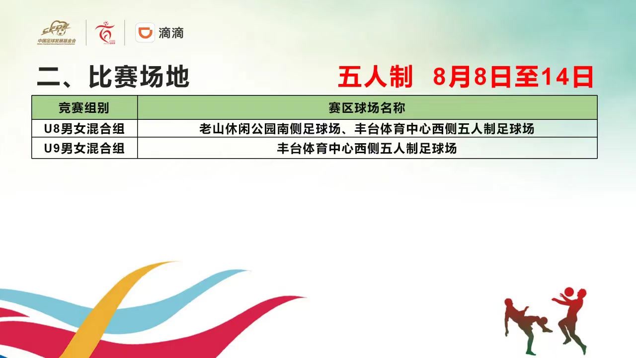 今年百队杯足球赛共有1212队、16296名参赛人员,其中五人制比赛时间为8月8日至14日,U8组比赛场地为老山休闲公园南侧足球场、丰台体育中心西侧五人制足球场;U9组别比赛场地为丰台体育中心西侧五人制足球场。