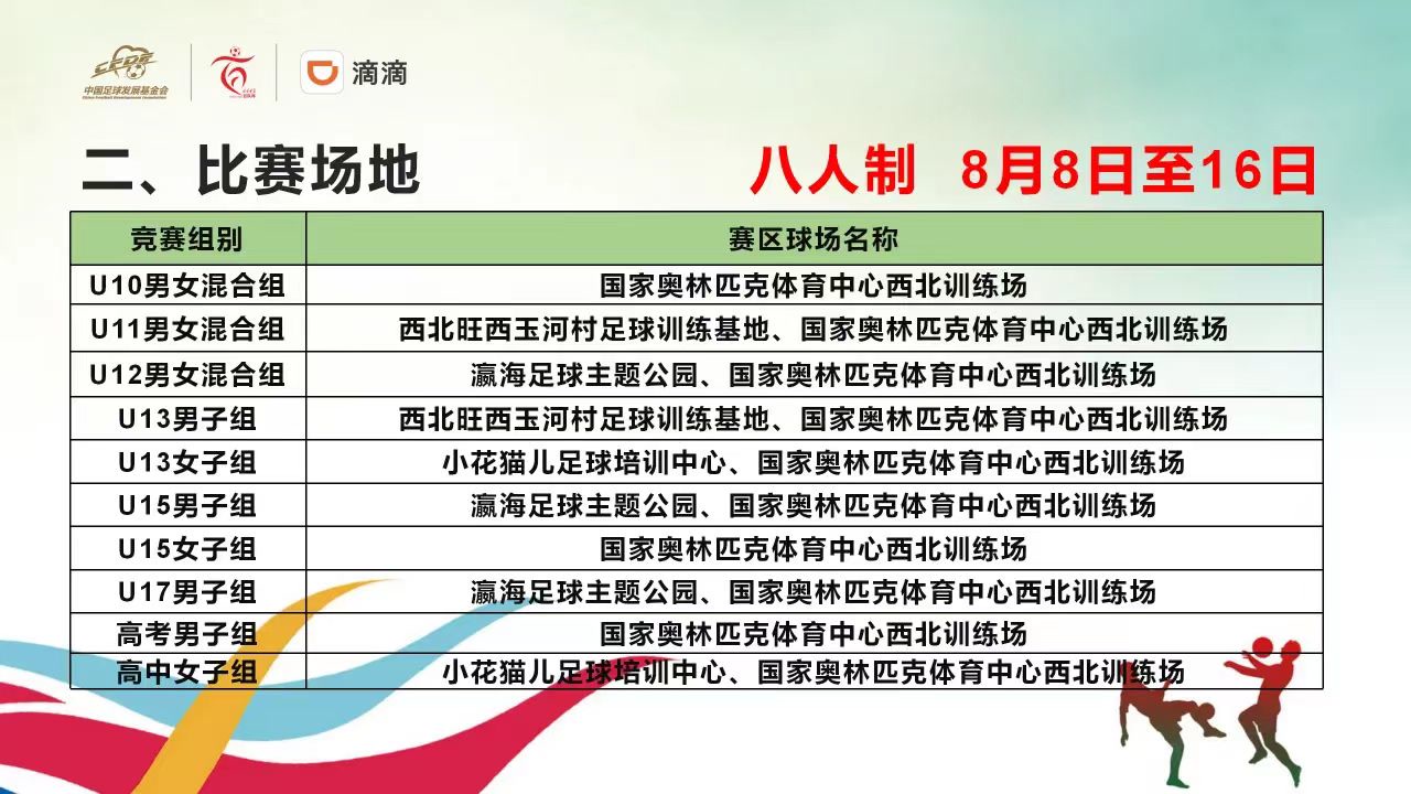 八人制比赛比赛时间为8月8日至16日,其中U10男女混合组比赛场地为国家奥林匹克体育中心西北训练场;U11男女混合组比赛场地为西北旺西玉河村足球训练基地、国家奥林匹克体育中心西北训练场;U12男女混合组比赛场地为瀛海足球主题公园、国家奥林匹克体育中心西北训练场;U13男子组比赛场地为西北旺西玉河村足球训练基地、国家奥林匹克体育中心西北训练场;U13女子组比赛场地为小花猫儿足球培训中心、国家奥林匹克体育中心西北训练场;U15男子组比赛场地为瀛海足球主题公园、国家奥林匹克体育中心西北训练场;U15女子组比赛场地为国家奥林匹克体育中心西北训练场;U17男子组比赛场地为瀛海足球主题公园、国家奥林匹克体育中心西北训练场;高考男子组比赛场地为国家奥林匹克体育中心西北训练场;高考女子组比赛场地为小花猫儿足球培训中心、国家奥林匹克体育中心西北训练场。