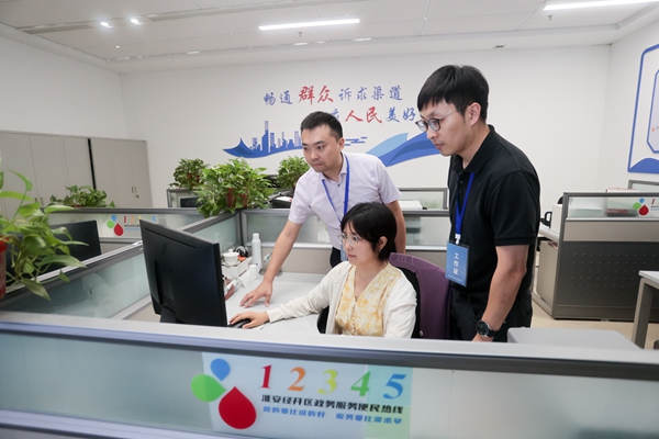 江苏省淮安经开区纪工委持续畅通“信、访、网、电”投诉举报渠道,从严从快处置问题线索,严肃纠治群众反映强烈的突出问题。图为该区纪检监察干部在调取12345热线工单办理记录。(江苏省淮安经济技术开发区纪工委 李俊 摄)
