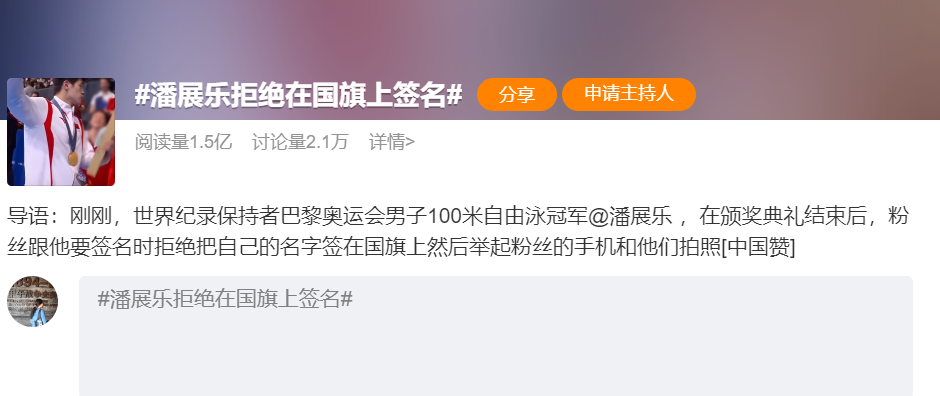 颁奖仪式结束,潘展乐走向观众席和场边泳迷合影自拍,有观众让他在国旗上签名,潘展乐婉拒说:“国旗上签不了。”
