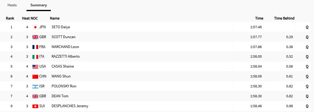 在中国游泳队中,汪顺和徐嘉余都是第四次征战奥运会。后者此前获得100米仰泳银牌的出色表现,激励了汪顺。这场预赛,他在实力较强的第4组出发,最终获得第三名,落后日本名将濑户大也和美国选手卡萨斯,排名小组第三。1分58秒09的成绩最终排名所有选手第6位,濑户大也1分57秒48排名第一。