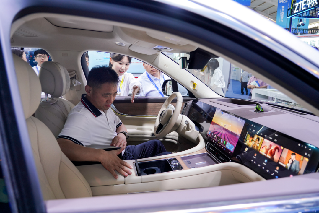 7月25日,观众在第八届南博会上体验新能源汽车。王静颐摄(新华社)