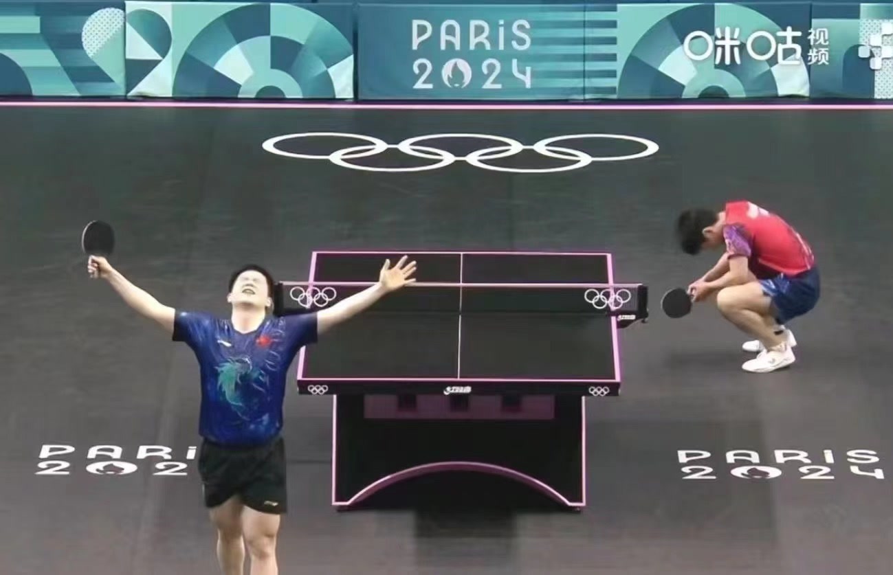 巴黎奥运会上北京时间今天凌晨诞生了一幅“经典画面”——樊振东举拍张开双臂,仿佛在拥抱那不可思议的瞬间,日本选手张本智和则沮丧地蹲下。这张视频截图画面产生出乒乓赛场强烈的对比,瞬间刷屏了今晨大众的社交媒体。