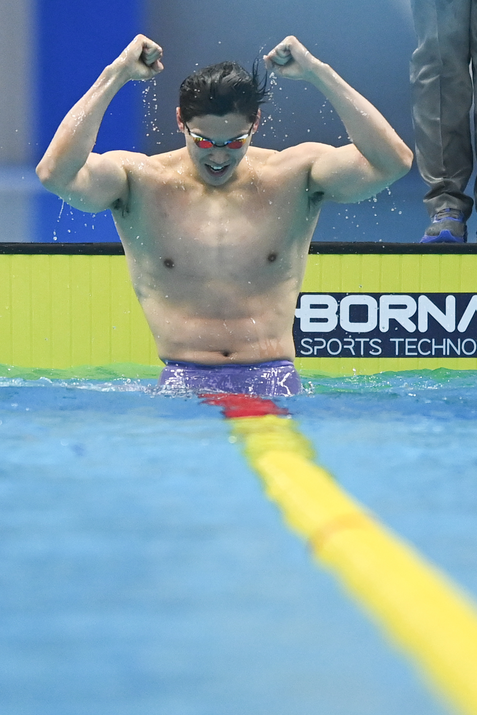 汪顺长久地倚在泳道线上,最后一个起身离开泳池。