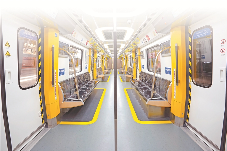 全球首列商用碳纤维地铁列车车厢内部的碳纤维立柱和碳纤维座椅。中车四方股份公司 供图