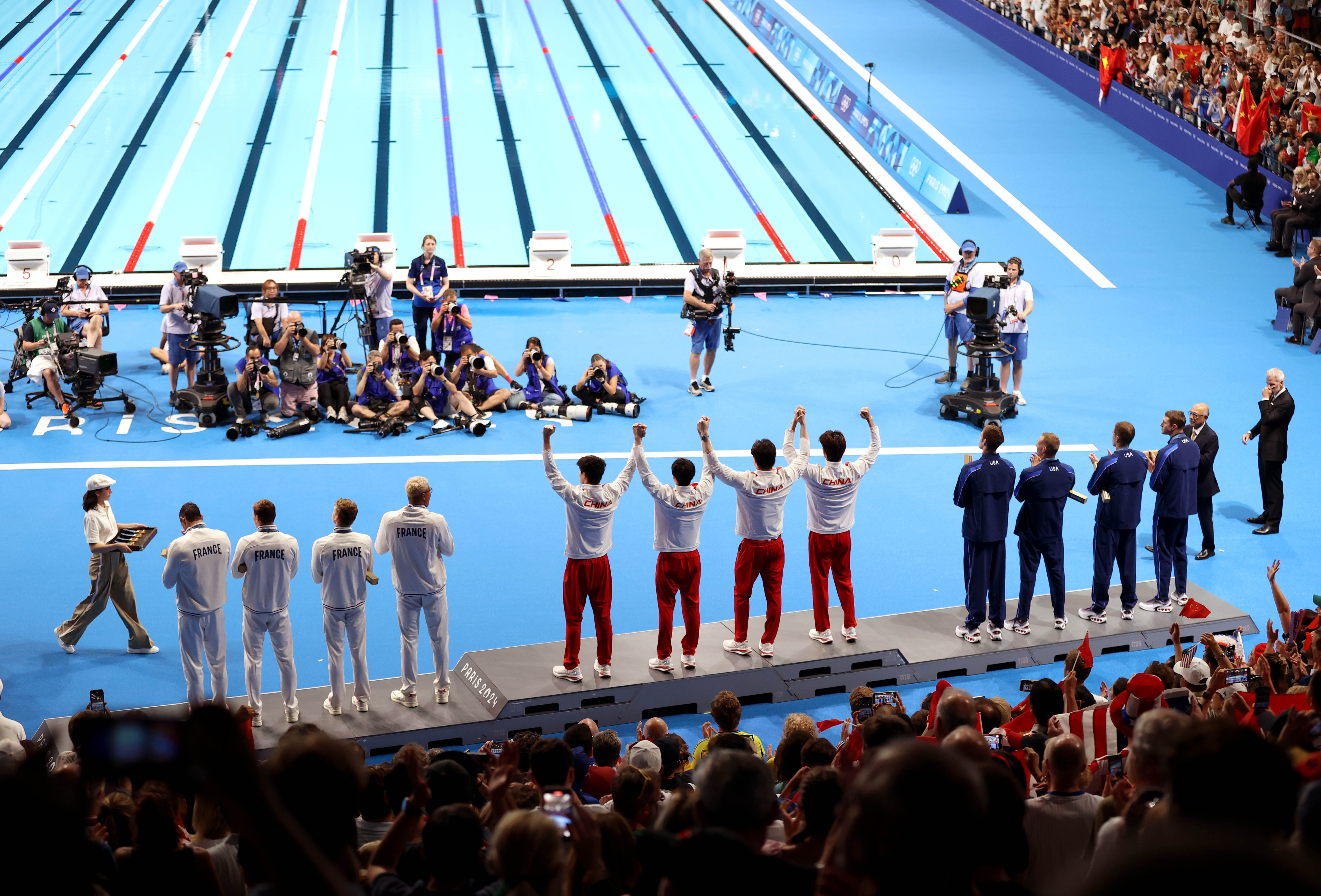 在颁奖仪式合影时,输得口服心服的美国队主动示意冠军中国队“要站在上面”,并和法国队一块坐了下来。随后,队员们一一友好握手拥抱。当赛后有外媒试图再度挑起所谓“兴奋剂”话题时,美国队队员墨菲说:“向中国队致敬,他们游了一场伟大的比赛。”