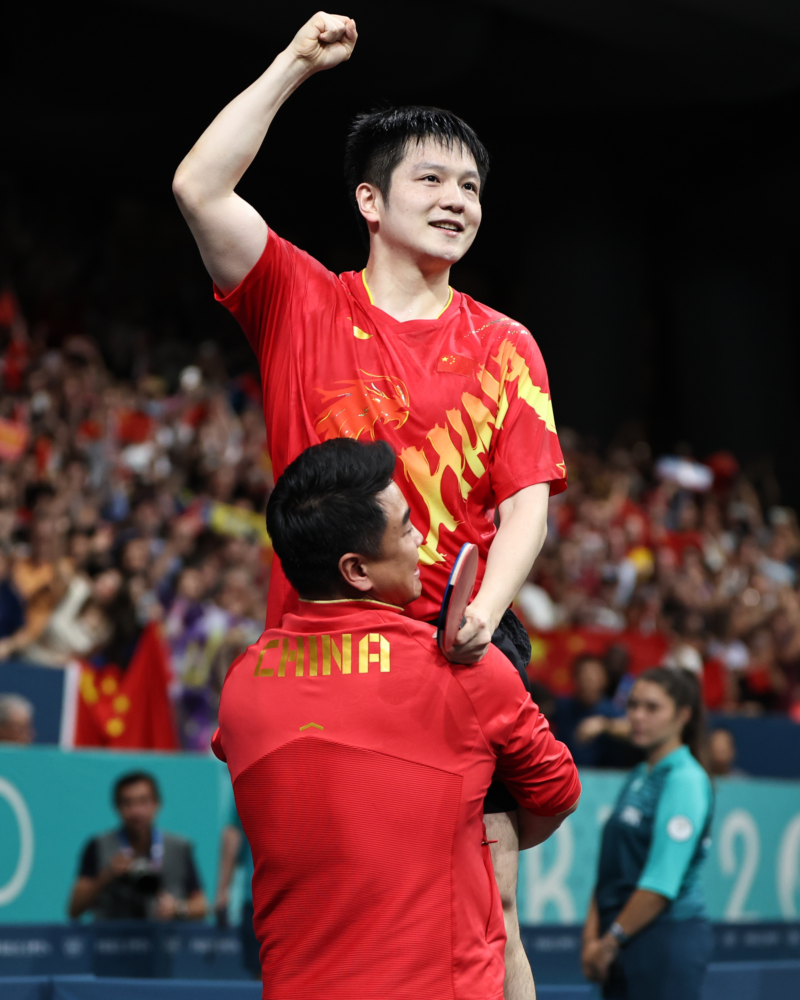 当王皓高高举起徒弟,跨越20年的圆满在这一刻实现——樊振东举起了他的金牌,王皓举起了他的冠军。