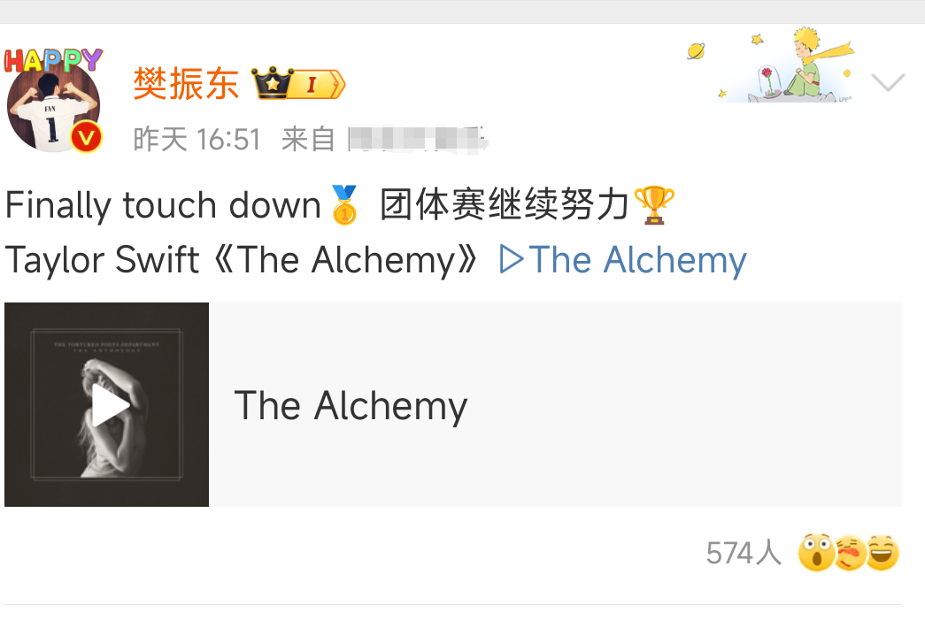 他先是分享了泰勒·斯威夫特的歌曲《炼金术》,又转发了一条祝贺自己夺冠的帖子,配图是记者提到的三次庆祝动作,还附上了一句西班牙语,中文翻译过来的意思是:“谢谢,没人能抵挡你胜利的欲望。”