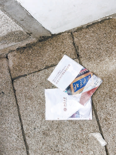 印有“北京大学研学”字样的手册被随意丢弃在博物馆门口。