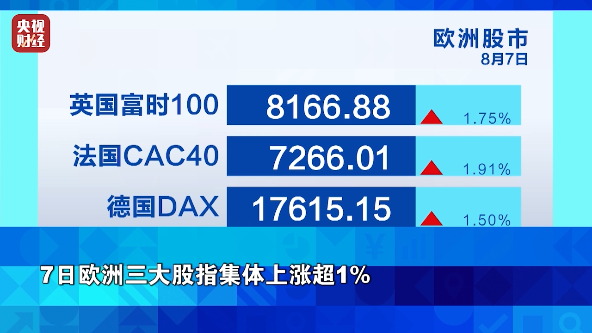 随着全球金融市场的恐慌情绪有所缓解,欧洲三大股指周三集体上涨超过1%,截至收盘,英国富时100指数上涨1.75%,法国CAC40指数上涨1.91%,德国DAX指数上涨1.50%。
