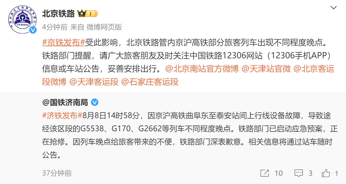 @国铁济南局 通告,8月8日14时58分,因京沪高铁曲阜东至泰安站间上行线设备故障,导致途经该区段的G5538、G170、G2662等列车不同程度晚点。铁路部门已启动应急预案,正在抢修。