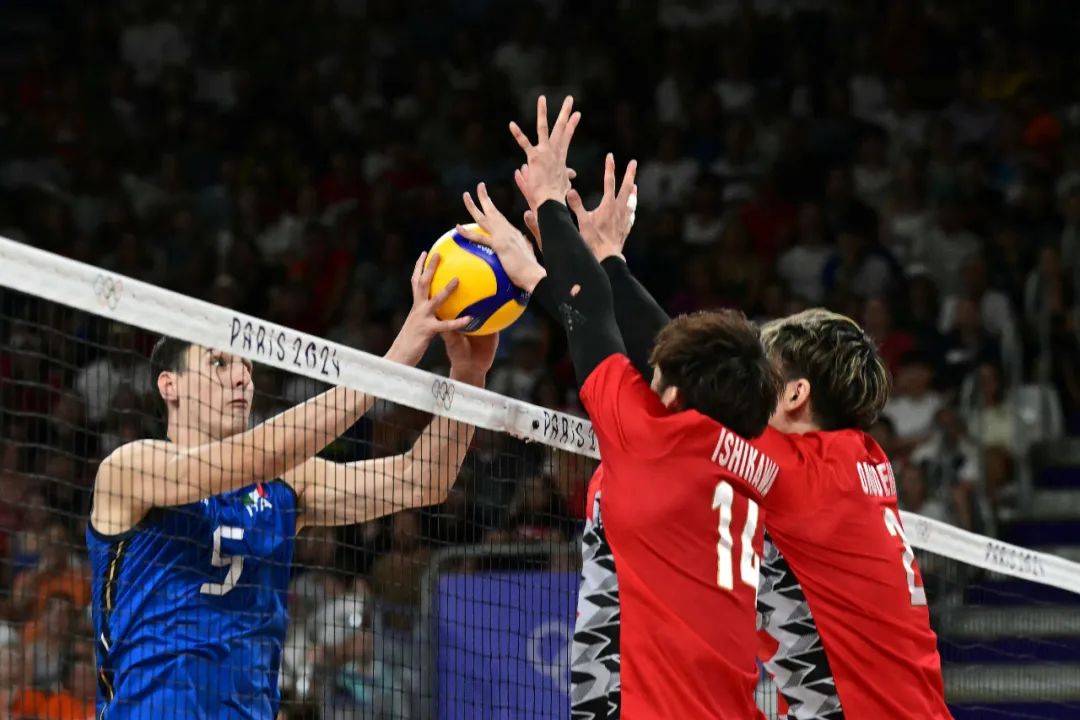 8月5日,巴黎奥运会男子排球四分之一决赛中,日本队与意大利队比赛。(法新社)