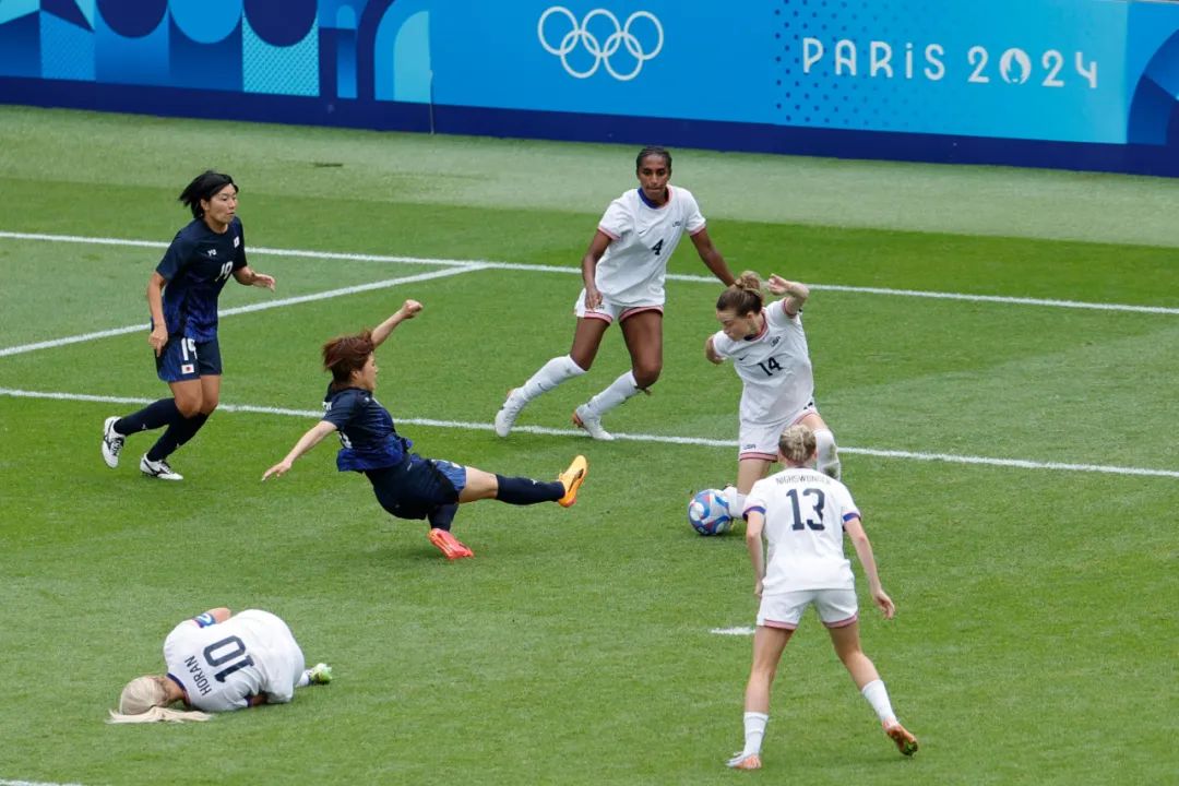 8月3日,巴黎奥运会女子足球四分之一决赛中,日本队与美国队比赛。(法新社)