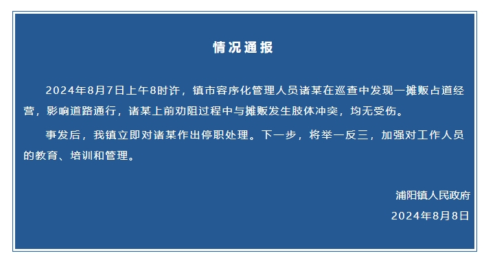 杭州萧山浦阳镇人民政府8月8日发布情况通报: