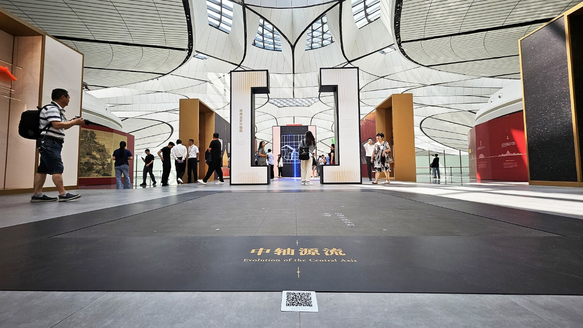 展览位于北京大兴国际机场航站楼五层,分为中轴文化的形成、中轴源流与北京明清中轴线的形成,共三个部分。