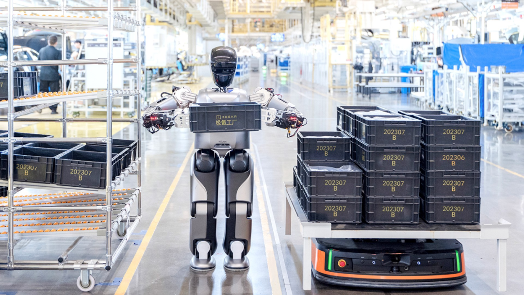 △Walker S Lite在极氪5G智慧工厂CTU入库上料工位协同员工执行搬运任务。