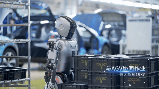 △Walker S Lite在极氪5G智慧工厂AGV协同作业完成搬运任务。