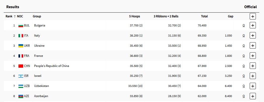 最终,中国队以2项总分67.900分排名第五,顺利晋级决赛。保加利亚队以2项总分70.400分排名第1,意大利队以69.350分排名第2,乌克兰队以68.950分排名第3,东道主法国队以68.800分排名第4。