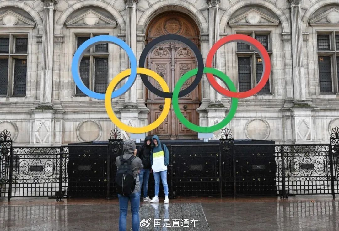 民众冒雨来到巴黎市政厅矗立着的奥运五环标志前拍照留念。中新社记者 李洋 摄