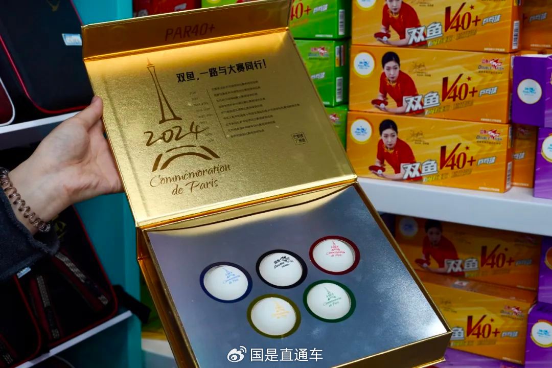 浙江义乌国际商贸城一位商户展示的双鱼PAR40+巴黎球纪念款礼盒,该球是巴黎奥运会乒乓球比赛官方指定用球。中新社记者 董易鑫 摄