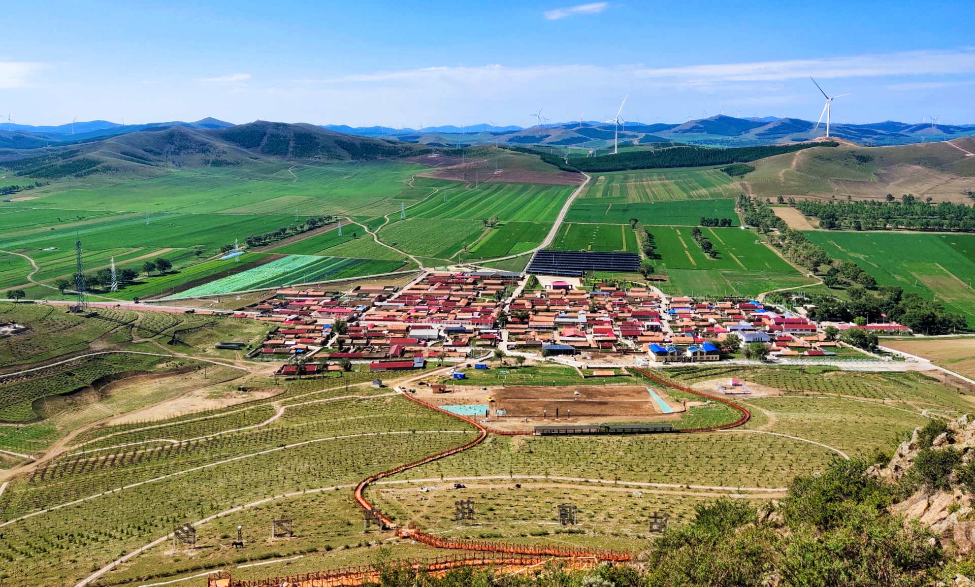 蓝蓝的天空上,洁白的云朵悠闲自在,与坝上的羊群遥相呼应。白云下,山峦满身绿装,金黄的莜麦随风掀起层层波浪。绿色掩映下,白墙红瓦的村庄,像一束火红的百合花,盛开在“油画”中。