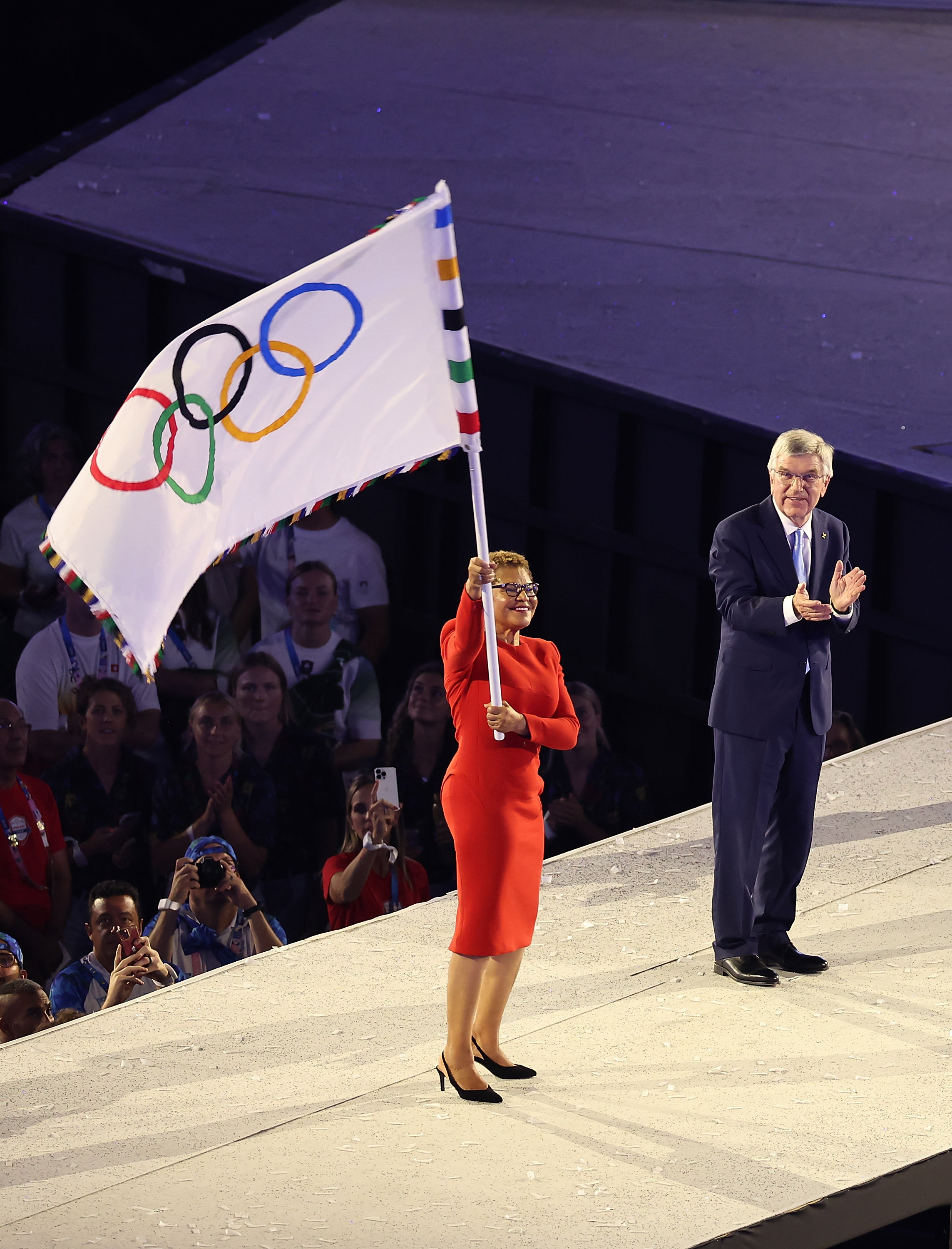 悠扬的乐曲声中,奥林匹克会旗缓缓降下。美国洛杉矶市市长从巴赫手中接过会旗,夏季奥运会跨越大西洋,进入“洛杉矶时间”。